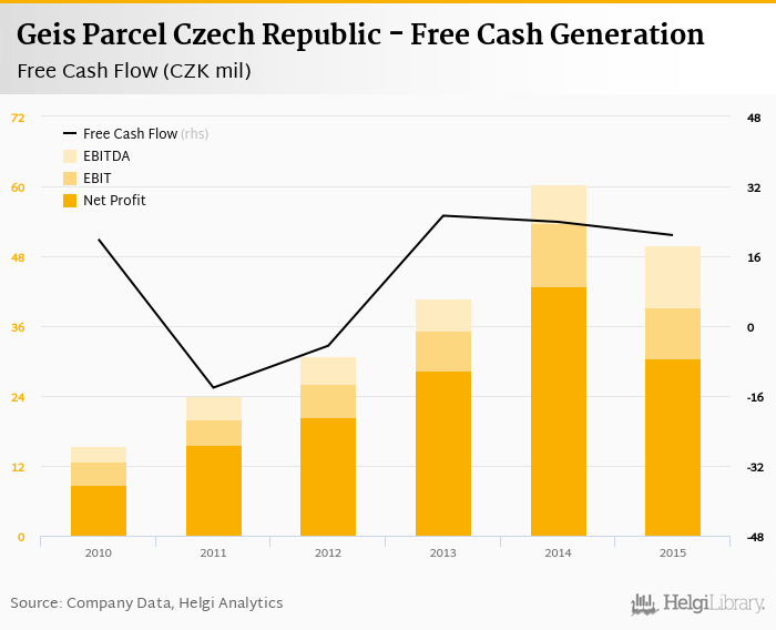 Geis Parcel Czech Republic made a net profit of CZK 30.4 mil with revenues of CZK 721 mil in 2015, down by 29.1% and up by 19.1%, respectively, compared to the previous year. This translates into a net margin of 4.22%.