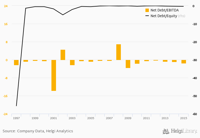 Historically, the firm’s net debt to equity reached a high of -0.044 in 2007 and a low of -55.8 in 1997 between 1997 and 2015. The average for the last five years was -0.207%.