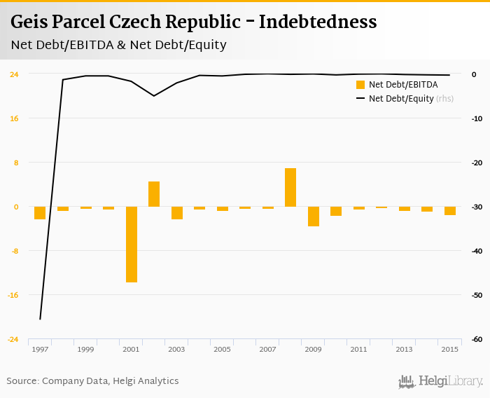 Geis Parcel Czech Republic's net debt stood at CZK -77.7 mil and accounted for -0.346 of equity at the end of 2015. The ratio is down 0.053 pp compared to the previous year.