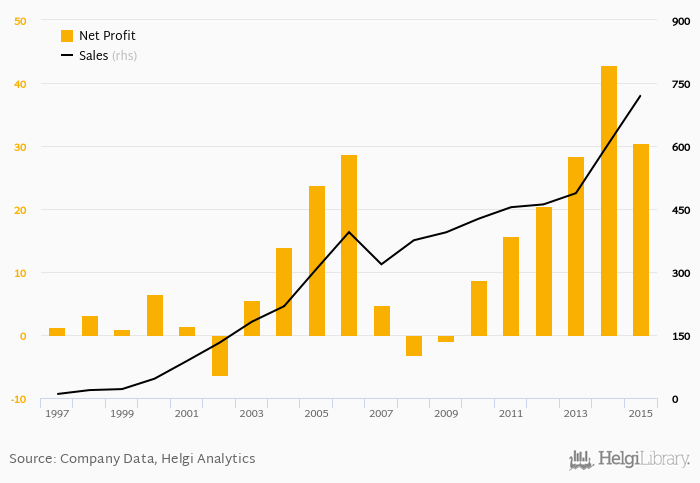 Sales have grown by 8.89% a year on average since 2005. They reached a high of CZK 721 mil in 2015 and a low of CZK 9.47 mil in 1997.