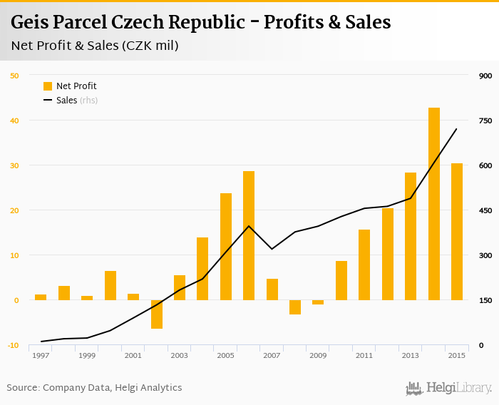 Geis Parcel Czech Republic made a net profit of CZK 30.4 mil in 2015, down 29.1% compared to the previous year. Total sales reached CZK 721 mil, which is up 19.1% when compared to the previous year.