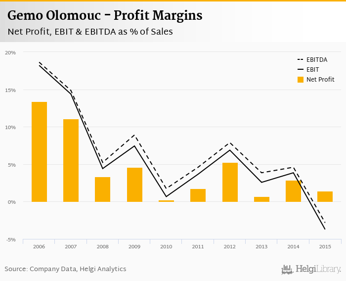 Gemo Olomouc made a net profit of CZK 36.3 mil with revenues of CZK 2,586 mil in 2015, down by 60.9% and down by 20.8%, respectively, compared to the previous year.