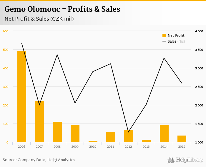 Gemo Olomouc made a net profit of CZK 36.3 mil in 2015, down 60.9% compared to the previous year. Total sales reached CZK 2,586 mil, which is down 20.8% when compared to the previous year.
