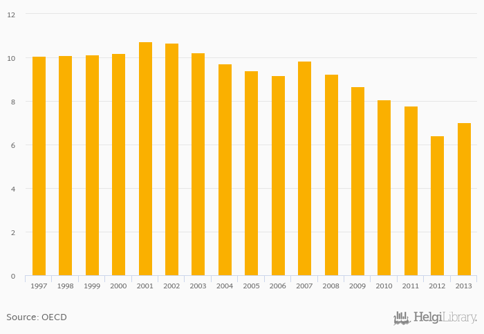 Historically, Gender Pay Gap (As % of Median Monthly Earnings) in Norway reached an all time high of 10.7% in 2001 and an all time low of 6.41% in 2012.