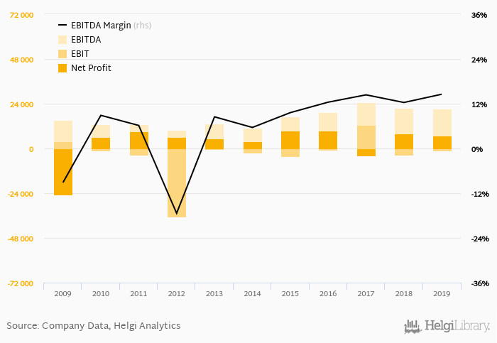 On the operating level, EBITDA reached USD 19,953 mil, up 10.2% compared to the previous year. Over the last five years, company's EBITDA has risen 17.9% a year on average.