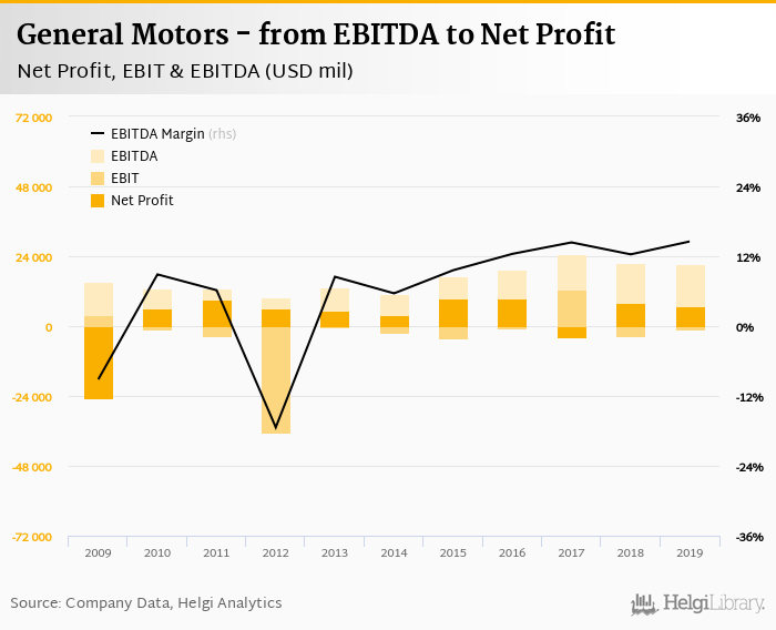 General Motors made a net profit of USD 6,732 mil with revenues of USD 137,237 mil in 2019, down by 16% and down by 6.67%, respectively, compared to the previous year. This translates into a net margin of 4.91%.