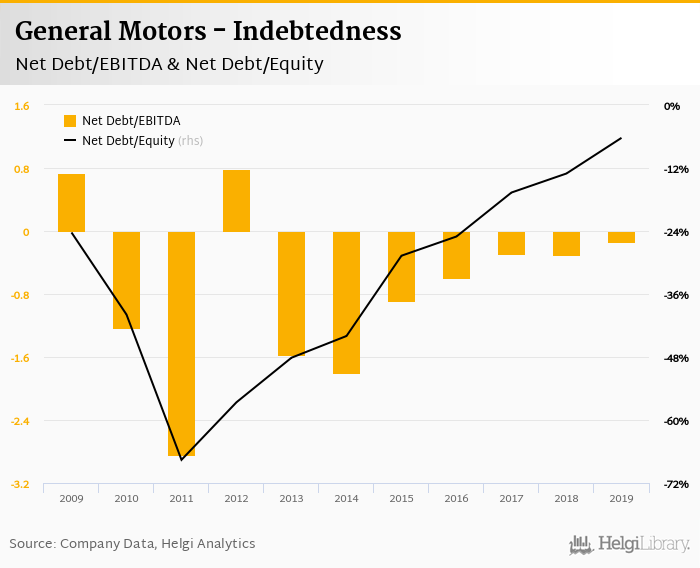 General Motors's net debt stood at USD -2,877 mil and accounted for -6.26% of equity at the end of 2019. The ratio is up 6.79 pp compared to the previous year.