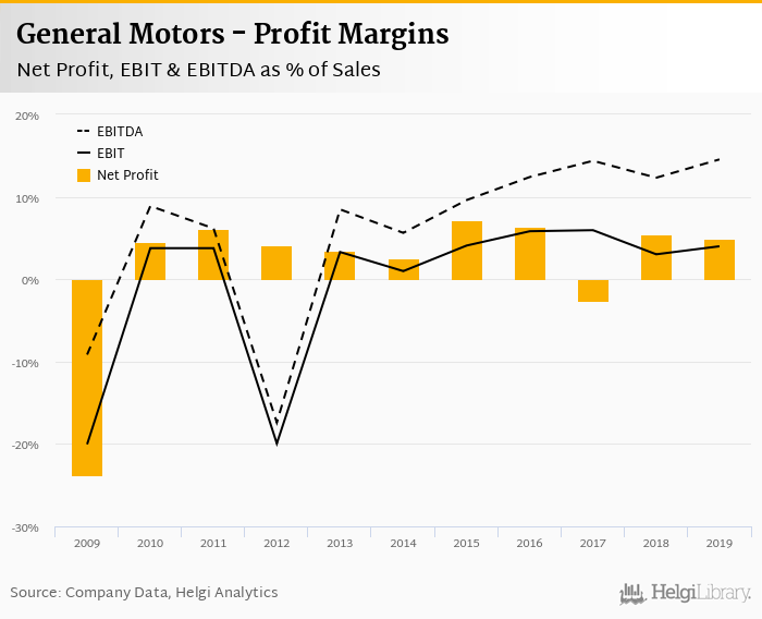 General Motors made a net profit of USD 6,732 mil with revenues of USD 137,237 mil in 2019, down by 16.0% and down by 6.67%, respectively, compared to the previous year.