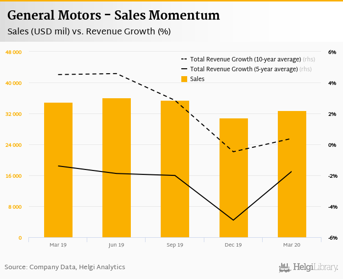 General Motors generated sales of USD 32,709 mil in 1Q2020, down 6.22% compared to the previous year. Historically, between 1Q2009 and 1Q2020, the company’s sales reached a high of USD 40,485 mil in 4Q2013 and a low of USD 22,431 mil in 1Q2009.