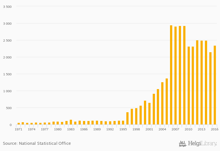 Historically, geothermal, biomass and other consumption in Argentina reached an all time high of 2,947 GWh in 2006 and an all time low of 57.0 GWh in 1971.