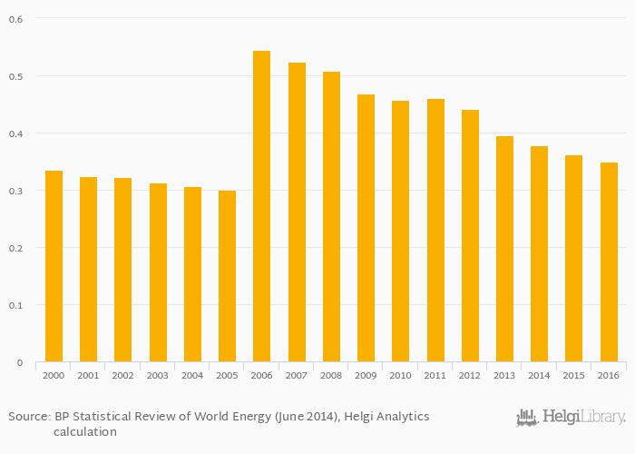Geothermal capacity as a share of worldwide geothermal power capacity fell 3.58% to 0.349% in Guatemala in 2016, according to World Bank / EIA.