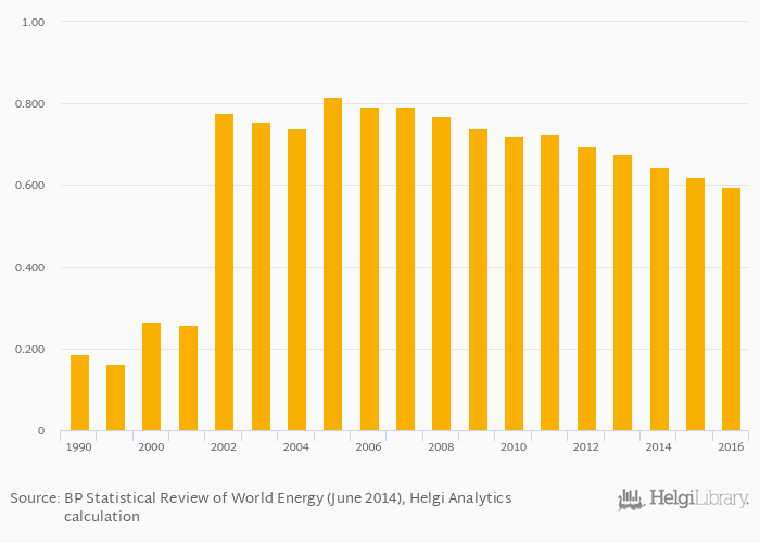 Historically, geothermal capacity as a share of worldwide geothermal power capacity in Russia reached an all time high of 0.816% in 2005 and an all time low of 0.163% in 1995. When compared to Russia's main peers, geothermal capacity as a share of worldwide geothermal power capacity in China amounted to 0.199%, 0.284% in Germany, 3.96% in Japan and 27.7% in USA in 2016.
