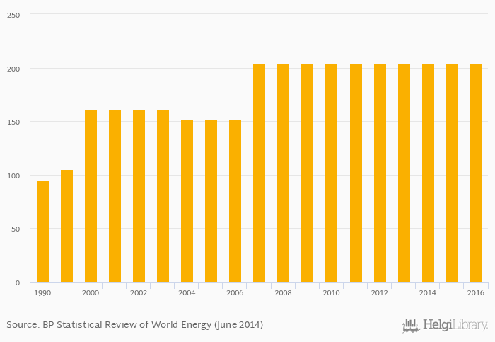 Historically, geothermal capacity in terms of cumulative installed power capacity in El Salvador reached an all time high of 204 MW in 2016 and an all time low of 95.0 MW in 1990. When compared to El Salvador's main peers, geothermal capacity in terms of cumulative installed power capacity in Costa Rica amounted to 208 MW, 48.0 MW in Guatemala, 0 MW in Honduras and 160 MW in Nicaragua in 2016.