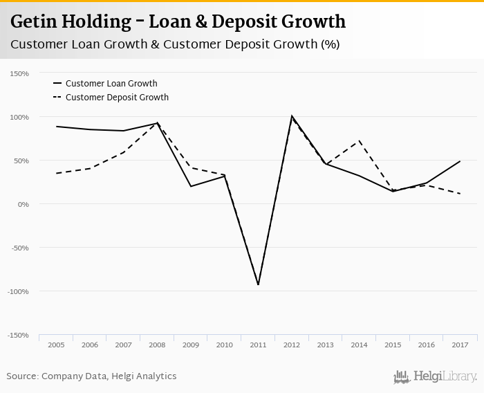Getin Holding's customer loan growth reached 48.5% in 2017, up from 23.5% compared to the previous year. Historically, the bank’s loans growth reached an all time high of 100% in 2012 and an all time low of -93.6% in 2011. In the last decade, the average annual loan growth amounted to 4.43%.