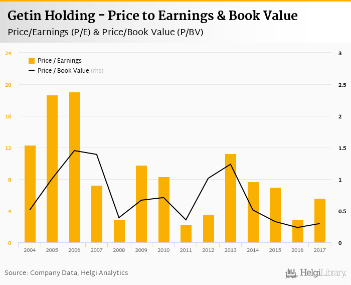 At the end of 2017, the bank traded at price to earnings of 5.61x. Within the last five years, the multiple reached an all time high of 11.2x in 2013 and an all time low of 2.94x in 2016 with an average of 6.89x.
