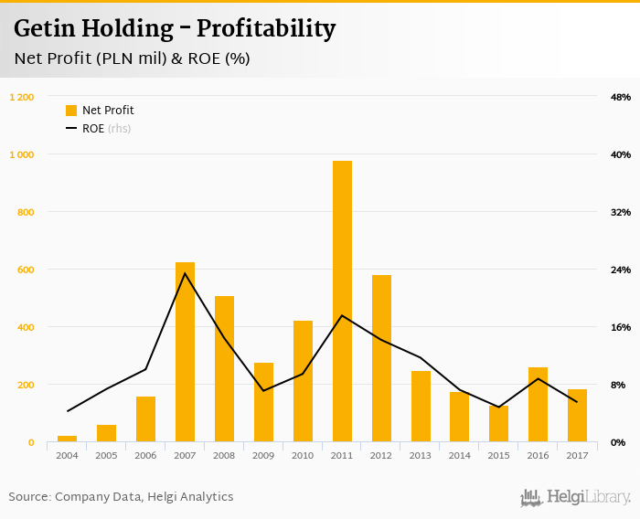 Comparing Getin Holding with its closest peers, Alior Bank generated a net profit of PLN 515 mil with ROE of 7.97% in 2017, Getin Noble Bank netted PLN -575 mil (ROE of -12.2%) and Idea Bank announced a net profit of PLN 231 mil implying ROE of 8.89%.