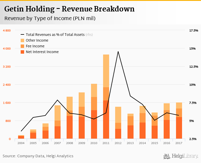 Comparing Getin Holding with its closest peers, Alior Bank generated total revenues of 5.34% of assets in 2017, Getin Noble Bank operated with 2.47% revenue margin and Idea Bank produced total income worth 4.82% of assets.