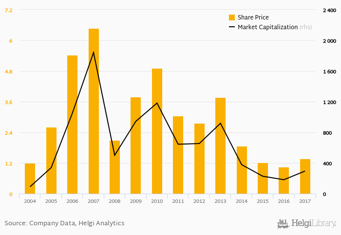 Since the end of 2012, the stock has depreciated by -50.0 % implying an annual average growth of -12.9 %. In absolute terms, the value of the company fell by USD -359 mil.