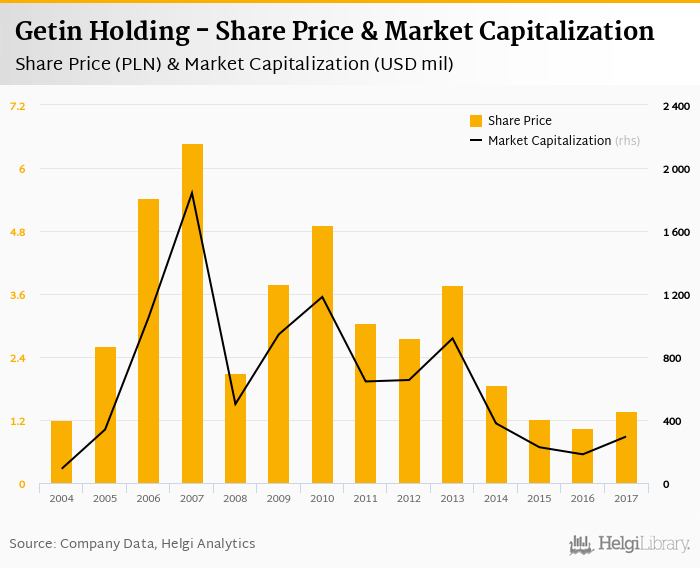 Getin Holding stock traded at PLN 1.38 per share at the end of 2017 implying a market capitalization of USD 295 mil.