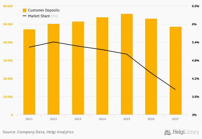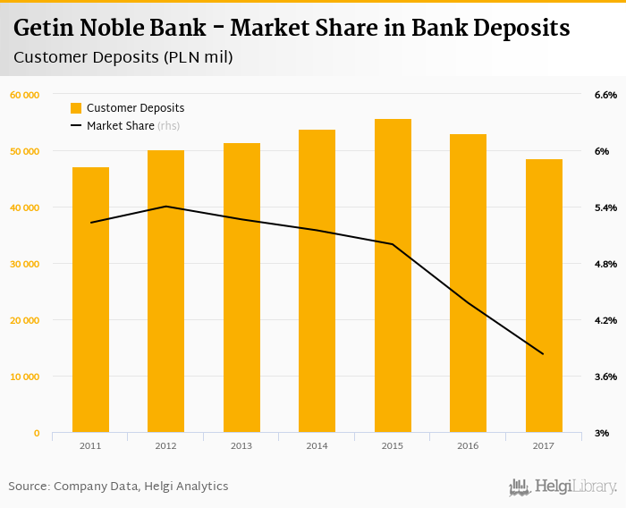 Getin Noble Bank accounted for 3.83% of all customer deposits taken by banks in Poland at the end of 2017. Historically, the bank’s market share in customer deposits reached an all time high of 5.40% in 2012 and an all time low of 3.83% in 2017.