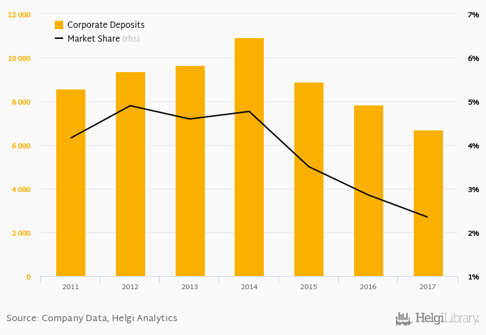 Getin Noble Bank accounted for 2.35% of all corporate deposits taken by banks in Poland at the end of 2017. Historically, the bank’s market share in corporate deposits reached an all time high of 4.90% in 2012 and an all time low of 2.35% in 2017.