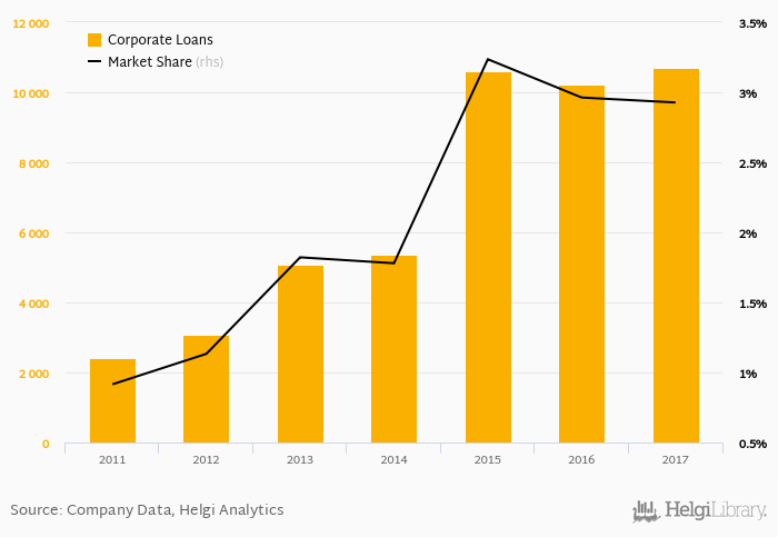 Getin Noble Bank accounted for 2.93% of all corporate loans issued in Poland at the end of 2017. Historically, the bank’s market share in corporate loans reached an all time high of 3.24% in 2015 and an all time low of 0.916% in 2011.