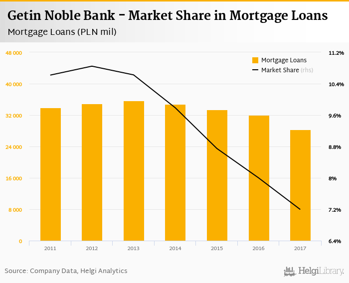 Getin Noble Bank accounted for 7.19% of all mortgage loans issued in Poland at the end of 2017. Historically, the bank’s market share in mortgage loans reached an all time high of 10.8% in 2012 and an all time low of 7.19% in 2017.