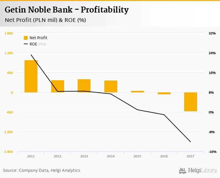 Comparing Getin Noble Bank with its closest peers, Alior Bank generated a net profit of PLN 515 mil with ROE of 7.97% in 2017, Getin Holding netted PLN 183 mil (ROE of 5.43%) and Idea Bank announced a net profit of PLN 231 mil implying ROE of 8.89%.
