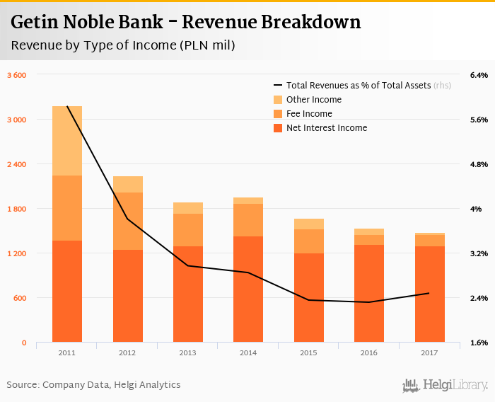 Comparing Getin Noble Bank with its closest peers, Alior Bank generated total revenues of 5.34% of assets in 2017, Getin Holding operated with 5.72% revenue margin and Idea Bank produced total income worth 4.82% of assets.