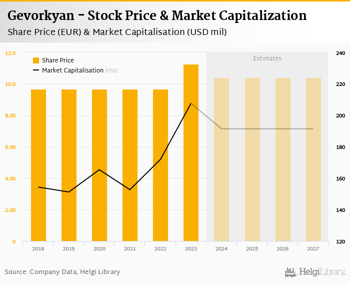 Gevorkyan stock traded at EUR 11.3 per share at the end 2023 implying a market capitalization of USD 208 mil.