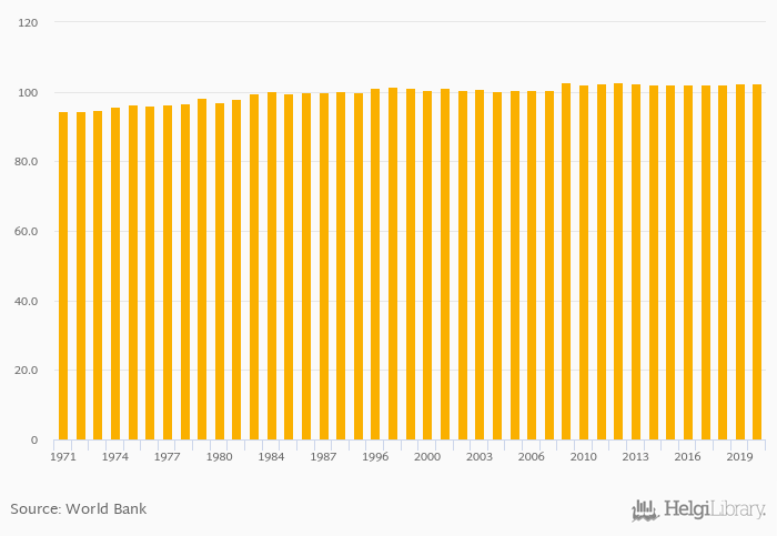 Historically, girls to boys in primary and secondary education in Ecuador reached an all time high of 103% in 2012 and an all time low of 94.3% in 1971.