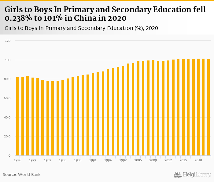 Girls to boys in primary and secondary education fell 0.238% to 101% in China in 2020, according to World Bank.