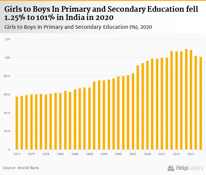 Girls to boys in primary and secondary education fell 1.25% to 101% in India in 2020, according to World Bank.