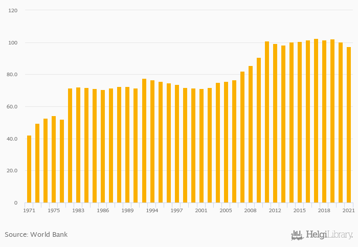 Historically, girls to boys in primary and secondary education in Djibouti reached an all time high of 103% in 2017 and an all time low of 42.1% in 1971.
