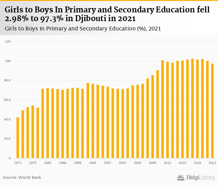 Girls to boys in primary and secondary education fell 2.98% to 97.3% in Djibouti in 2021, according to World Bank.