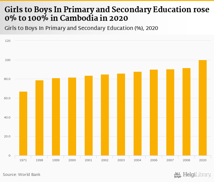 Girls to boys in primary and secondary education rose 0% to 100% in Cambodia in 2020, according to World Bank.