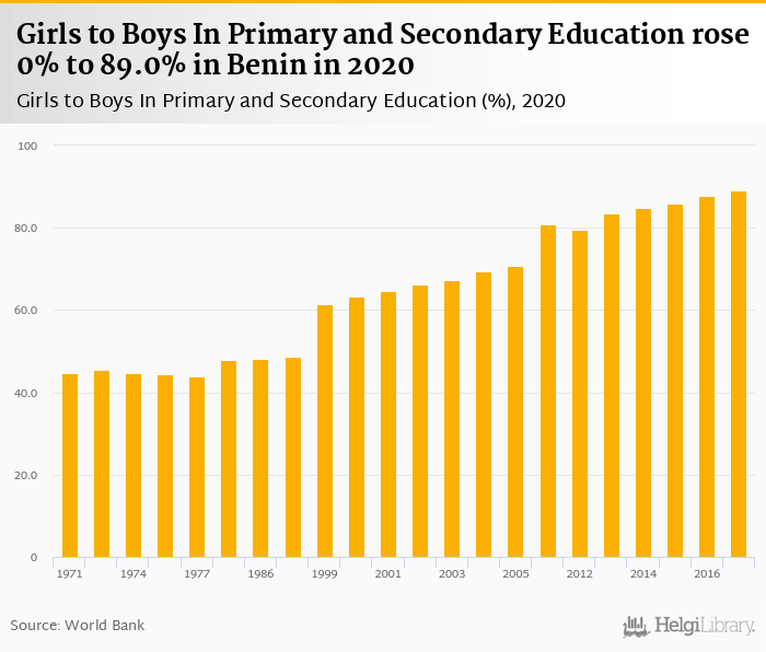Historically, girls to boys in primary and secondary education in Benin reached an all time high of 89.0% in 2020 and an all time low of 44.0% in 1977.