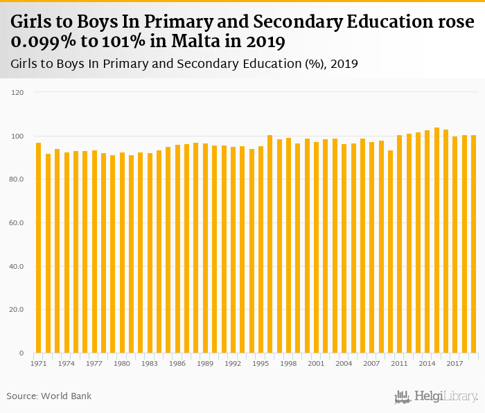 Girls to boys in primary and secondary education rose 0.099% to 101% in Malta in 2019, according to World Bank.