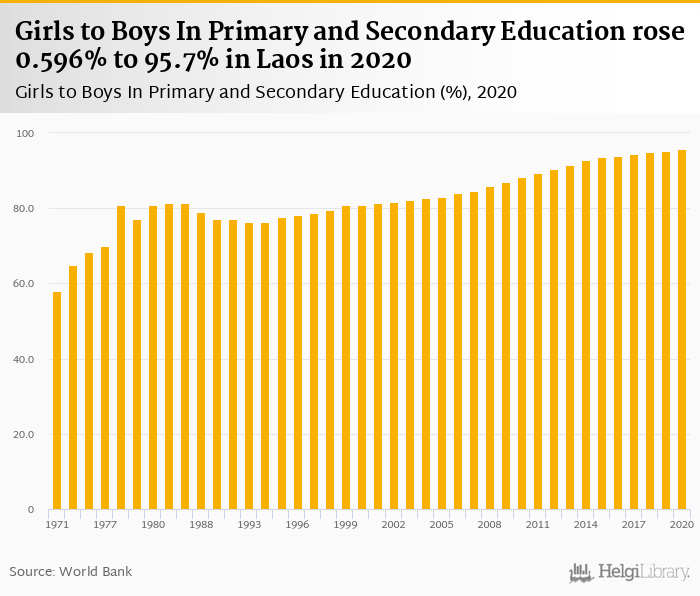 Girls to boys in primary and secondary education rose 0.596% to 95.7% in Laos in 2020, according to World Bank.