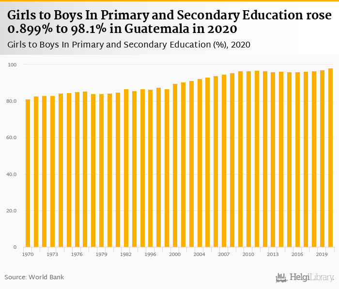 Girls to boys in primary and secondary education rose 0.899% to 98.1% in Guatemala in 2020, according to World Bank.