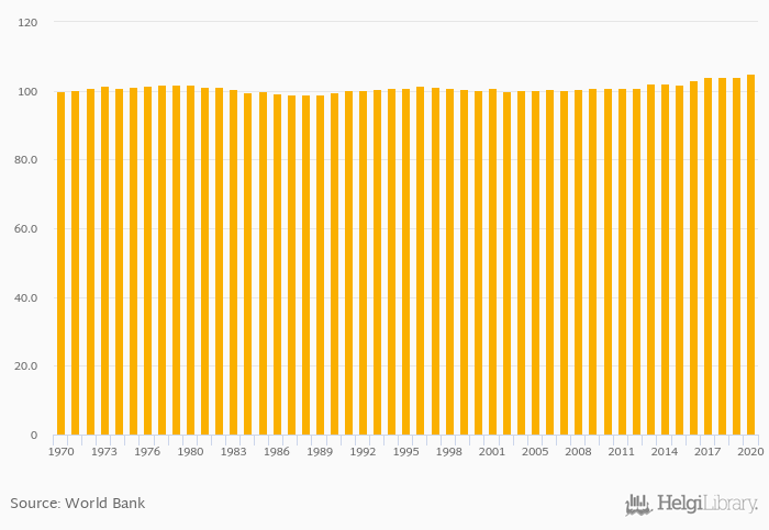 Historically, girls to boys in primary and secondary education in Costa Rica reached an all time high of 105% in 2020 and an all time low of 98.8% in 1989.