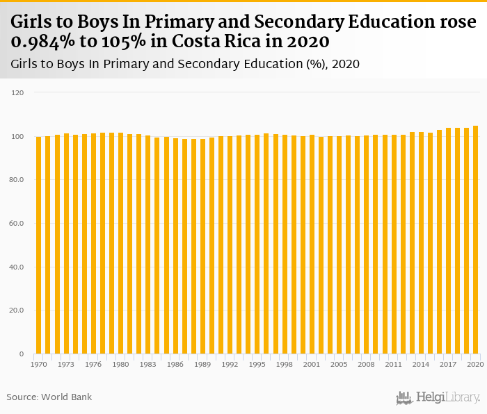 Girls to boys in primary and secondary education rose 0.984% to 105% in Costa Rica in 2020, according to World Bank.
