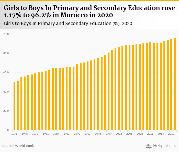 Girls to boys in primary and secondary education rose 1.17% to 96.2% in Morocco in 2020, according to World Bank.