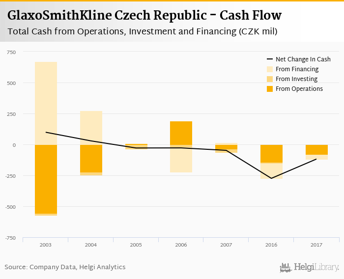 Cash from financing amounted to CZK -38.0 mil, so the company generated CZK -118 mil net cash in 2017.