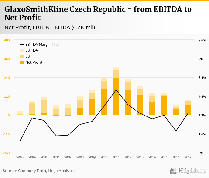 GlaxoSmithKline Czech Republic made a net profit of CZK 65.4 mil with revenues of CZK 2,897 mil in 2017, up by 72% and down by 14.6%, respectively, compared to the previous year. This translates into a net margin of 2.26%.