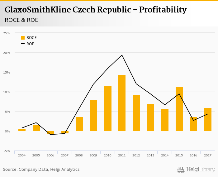 GlaxoSmithKline Czech Republic made a net profit of CZK 65.4 mil in 2017, up 72% compared to the previous year. Historically, between 2003 and 2017, the company's net profit reached a high of CZK 240 mil in 2011 and a low of CZK -7.67 mil in 2006.