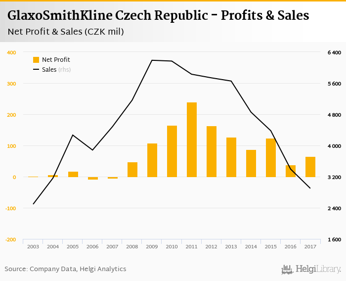 GlaxoSmithKline Czech Republic made a net profit of CZK 65.4 mil in 2017, up 72% compared to the previous year. Total sales reached CZK 2,897 mil, which is down 14.6% when compared to the previous year.