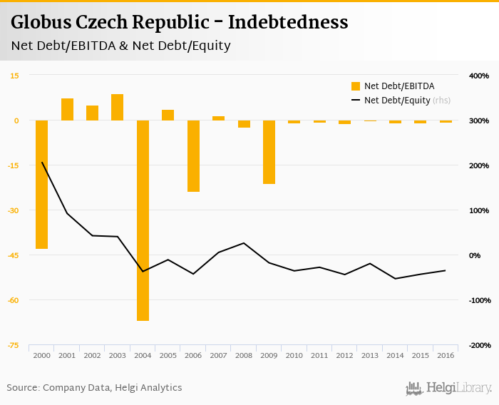 Globus Czech Republic's net debt stood at CZK -544 mil and accounted for -35.5% of equity at the end of 2016. The ratio is up 8.36 pp compared to the previous year.