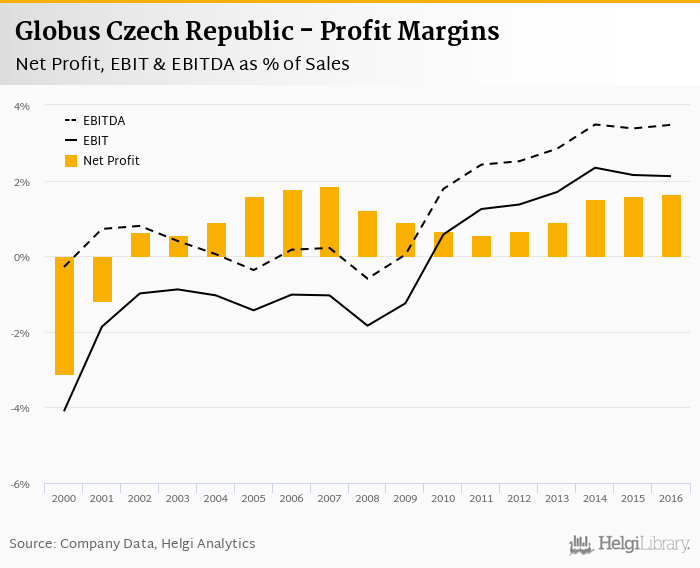 Globus Czech Republic made a net profit of CZK 374 mil with revenues of CZK 22,836 mil in 2016, up by 2.43% and up by 0.096%, respectively, compared to the previous year.