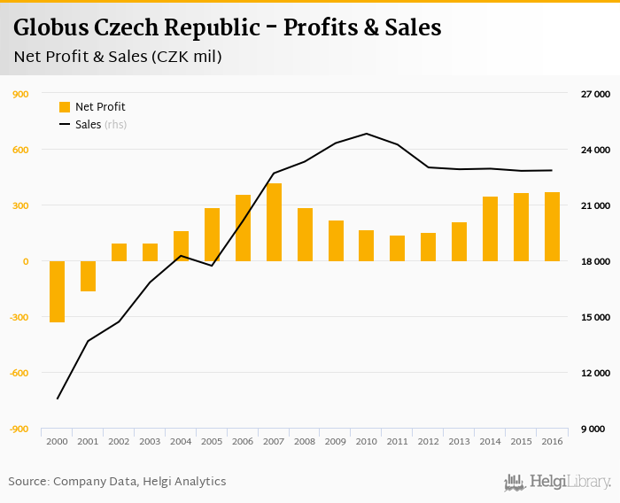 As far as Globus Czech Republic's peers are concerned, BILLA Czech Republic posted a net profit and sales of CZK 469 mil and CZK 22,763 mil in 2016, Kaufland Czech Republic generated a net profit of CZK 1,974 mil (with sales of CZK 56,819 mil), and Lidl Czech Republic netted USD CZK 4,104 mil (sales of CZK 43,748 mil).